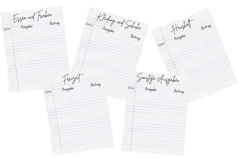 Notiere so vollständig wie möglich deine variablen Ausgaben. Für einen besseren Überblick solltest du deine Ausgaben in „Essen und Trinken“ und „Kleidung“ aufteilen. Tipp: Sammle Belege und vergiss auch die kleineren Beträge nicht, denn Kleinvieh macht bekanntlich auch Mist. Wenn du keinen Beleg bekommst, dann notiere dir die Summe auf einem Zettel. Auch Einkäufe, die du per Karte zahlst und die irgendwann vom Konto abgebucht werden, gehören in den Budgetplaner. Wenn du nicht penibel bist, dann stimmt am Ende die Buchhaltung nicht. Sammle deine Notizen und Belege in einer Box und trage sie einmal die Woche in deinen Budgetplaner ein.