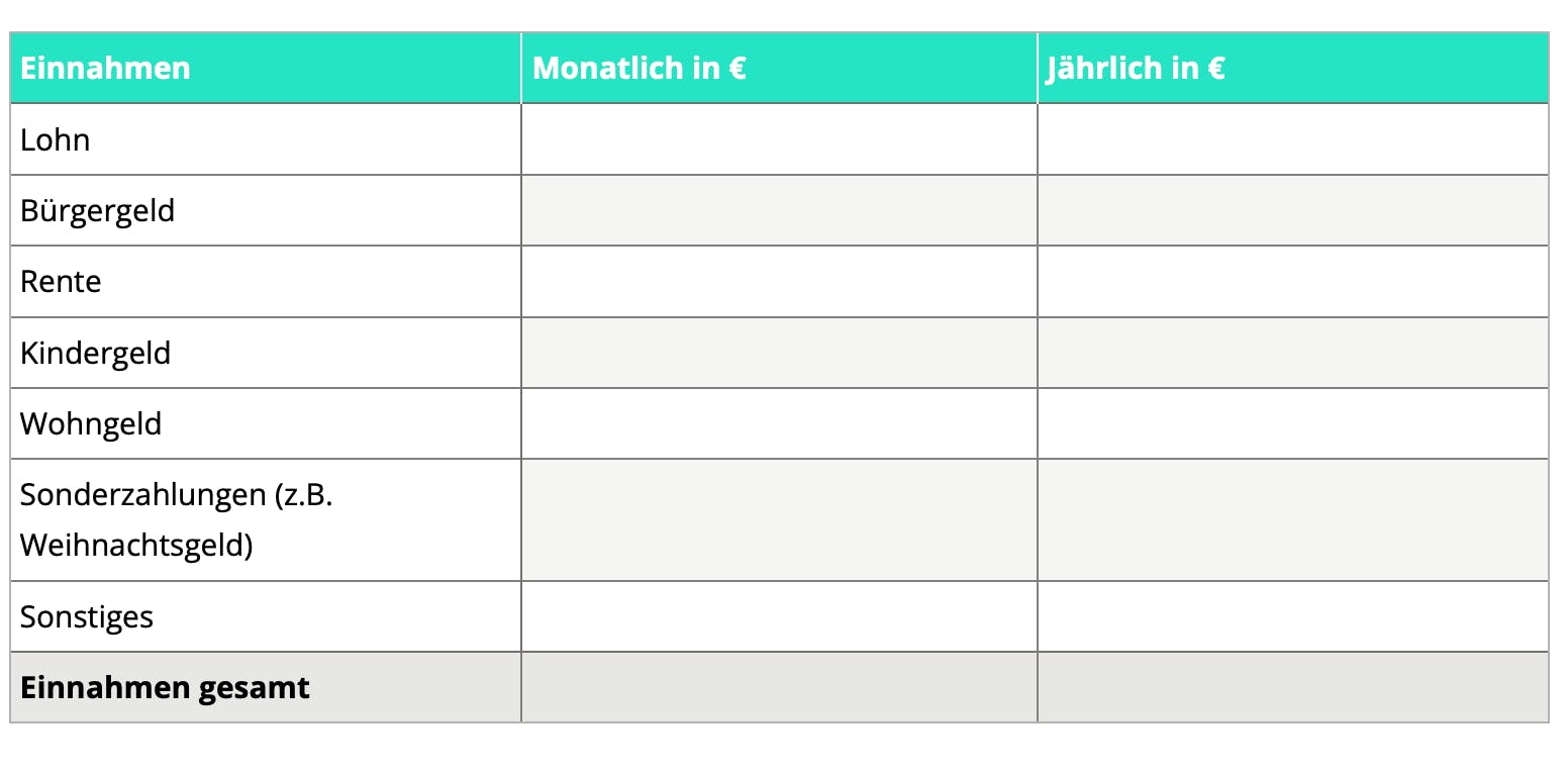 Hier solltest du deine regelmäßigen Einnahmen aufschreiben. Ich kann nicht genug betonen, dass ich regelmäßige Einnahmen meine. Das ist zum Beispiel dein Lohn, Kindergeld, Bürgergeld oder BAföG. Unter keinen Umständen solltest du hier Geldgeschenke zum Geburtstag oder Weihnachtsgeld berücksichtigen.