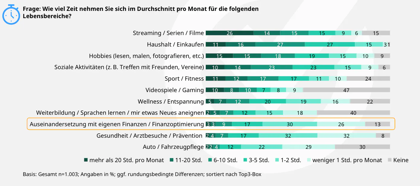 26 % der Befragten investieren monatlich mehr als 20 Stunden in Streaming-Angebote. Mit ihren finanziellen Angelegenheiten setzen sich die meisten hingegen deutlich seltener auseinander.
