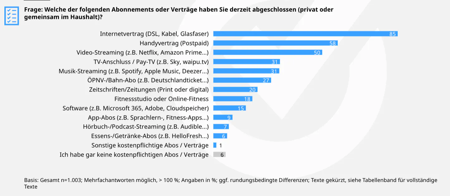 Fast jeder Haushalt besitzt einen Internetvertrag, gefolgt von Handyverträgen. Nur 6 % der Befragten geben an, keine Abonnements zu haben.