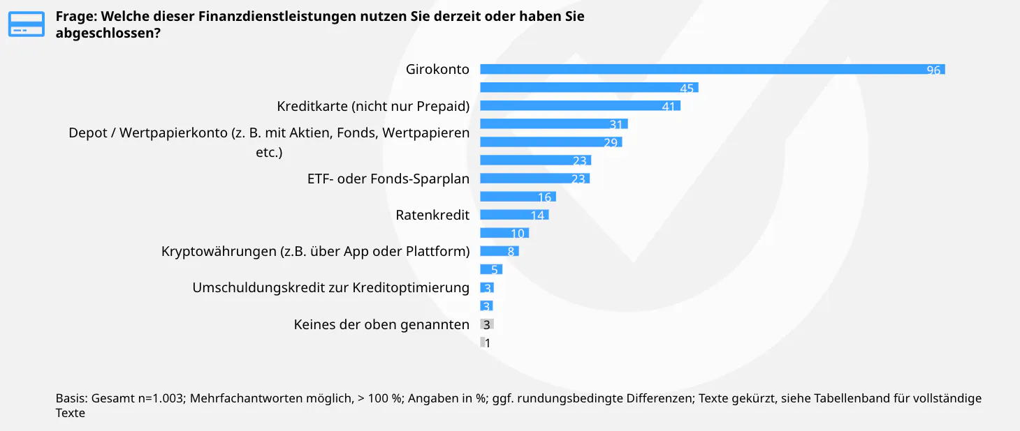 Das Girokonto ist die meistgenutzte Finanzdienstleistung und wird von nahezu allen Befragten genutzt. Darauf folgen Tagesgeldkonto und Kreditkarte.
