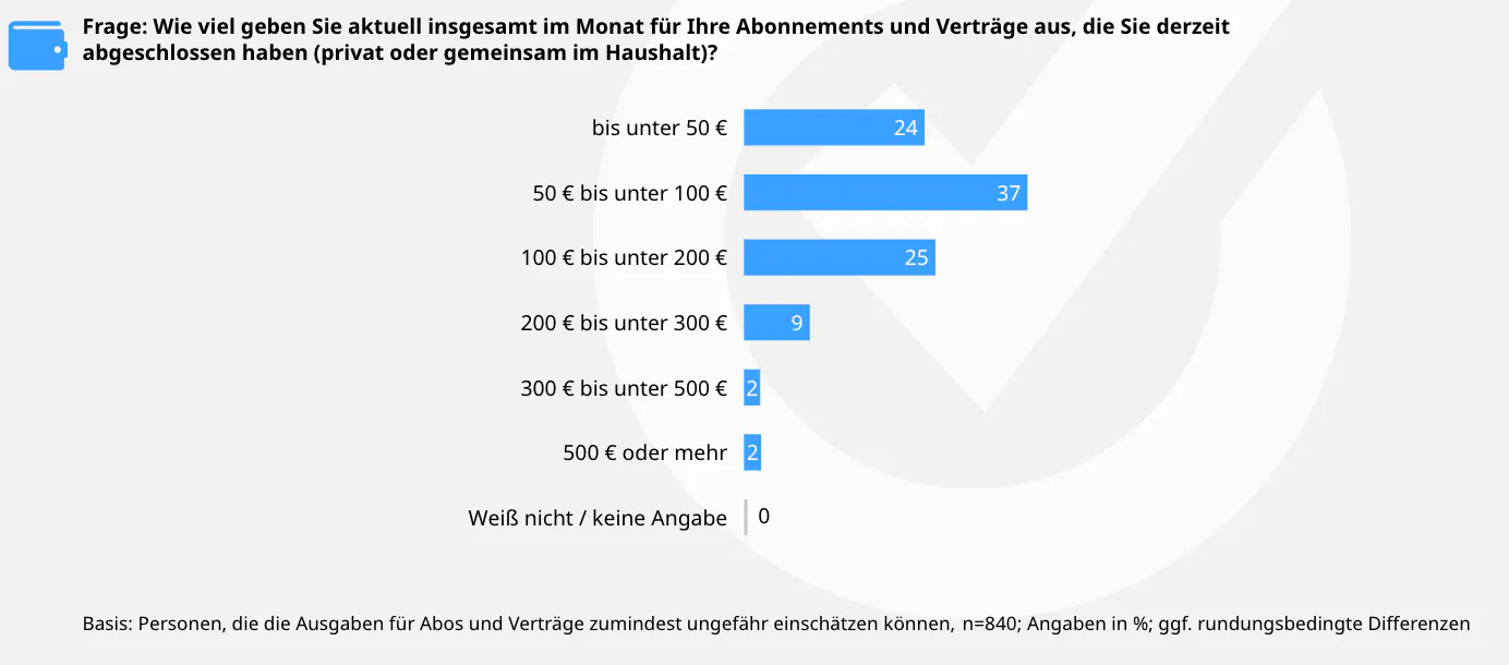 86 % geben an, dass ihre monatlichen Ausgaben für Abos und Verträge unter 200 € liegen. Nur 13 % liegen darüber.