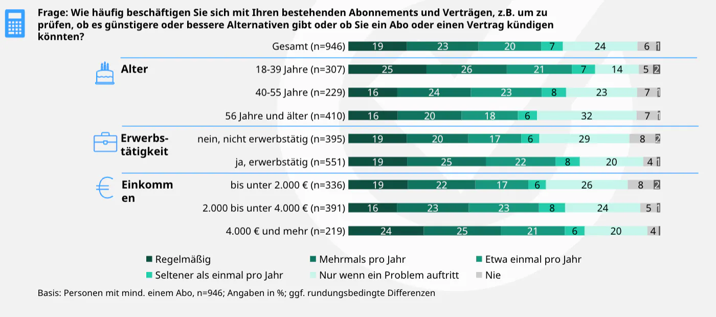 42 % überprüfen ihre Abos mindestens mehrmals jährlich. Personen im Alter von 18 bis 39 Jahren tun dies häufiger als ältere Befragte.