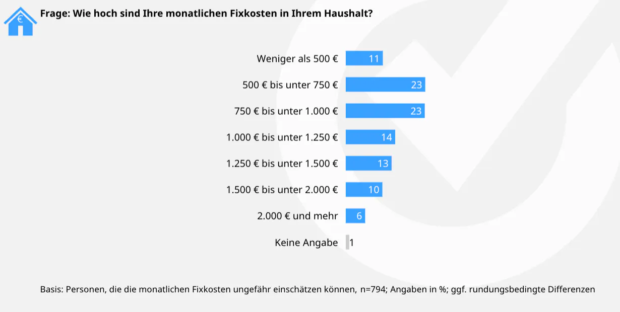 Bei den meisten Haushalten liegen die monatlichen Fixkosten zwischen 500 € und 1.000 % (46 %), während 29 % 1.250 € oder mehr ausgeben.