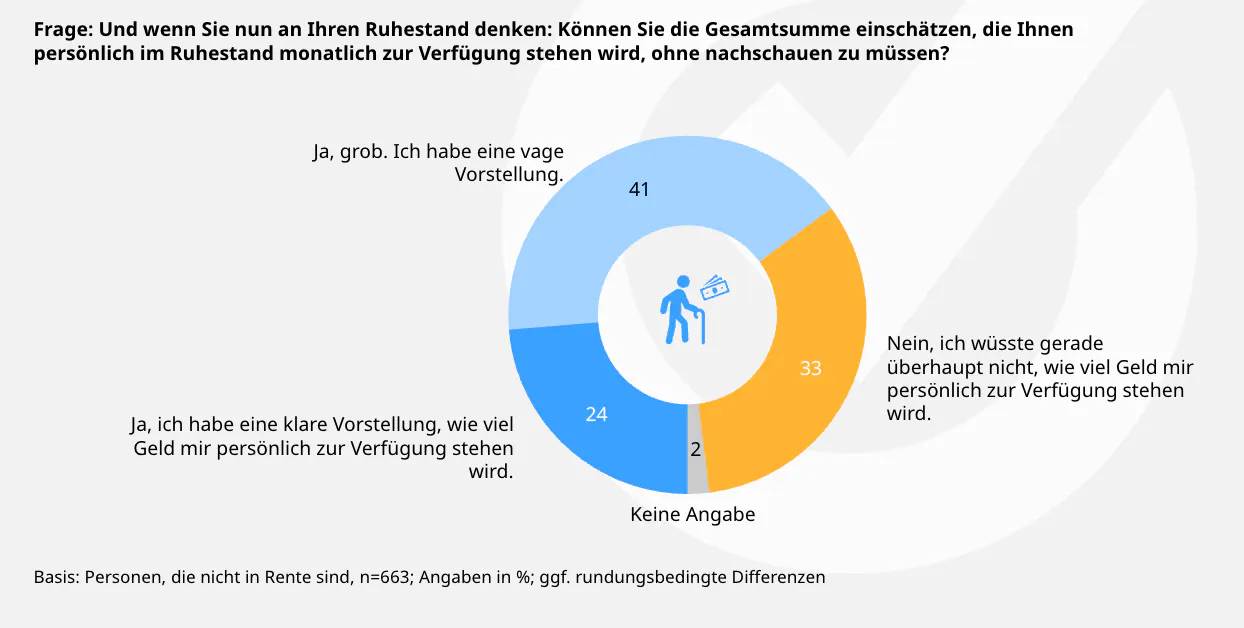 Ein Viertel der Befragten weiß genau, wie hoch ihre monatliche Rente sein wird. Die Mehrheit ist unsicher: 41 % haben nur eine grobe Vorstellung, 33 % überhaupt keine.