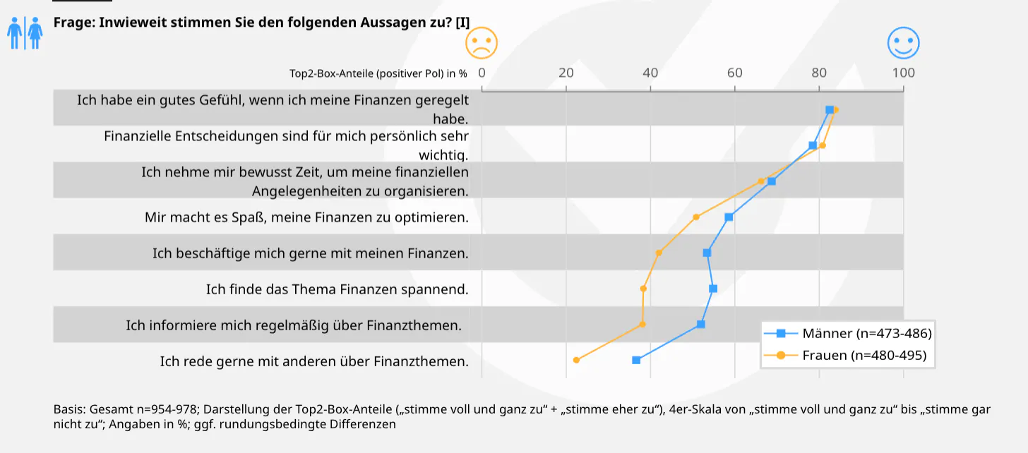 Männer zeigen oft eine eher positive Einstellung gegenüber Finanzthemen: Sie finden Finanzen interessanter und setzen sich lieber damit auseinander als Frauen.
