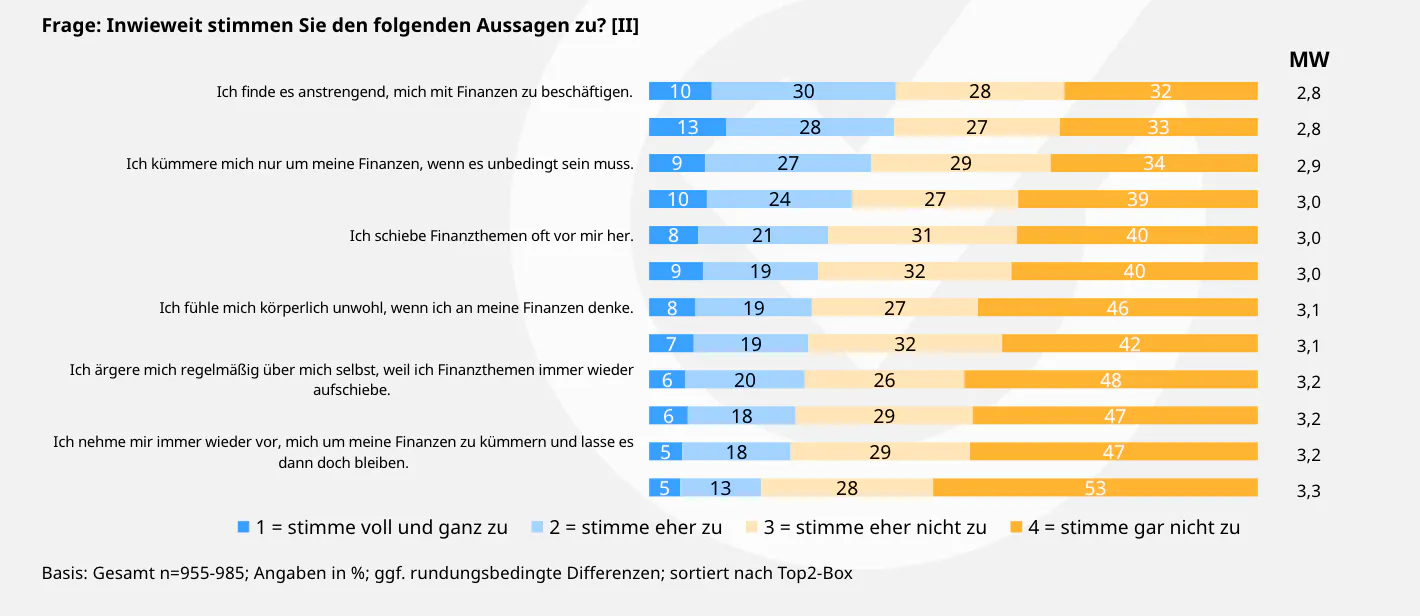 Für zahlreiche Befragte ist der Umgang mit Finanzen mit negativen Emotionen verknüpft: 40 % empfinden ihn als anstrengend, weitere 40 % als lästig.