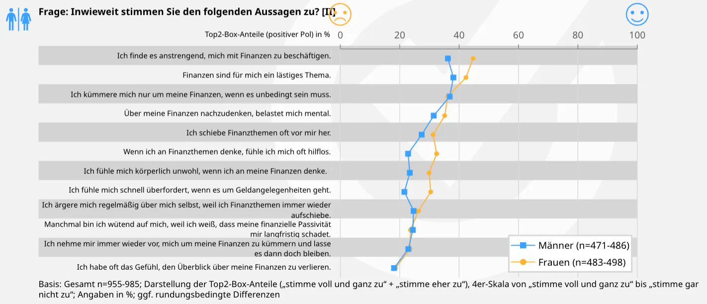 Frauen zeigen häufiger eine negative Einstellung gegenüber Finanzen: Sie empfinden den Umgang damit oft als anstrengend oder fühlen sich überfordert.